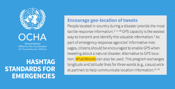 3 word addresses are automatically attached to every photo and report, allowing teams on the ground to find the exact location of the problem faster and to respond more efficiently. UNOCHA is also encouraging communities and responders to include a 3 word address when tweeting from a disaster area, so information shared on social media can also be collected and linked to a precise location.