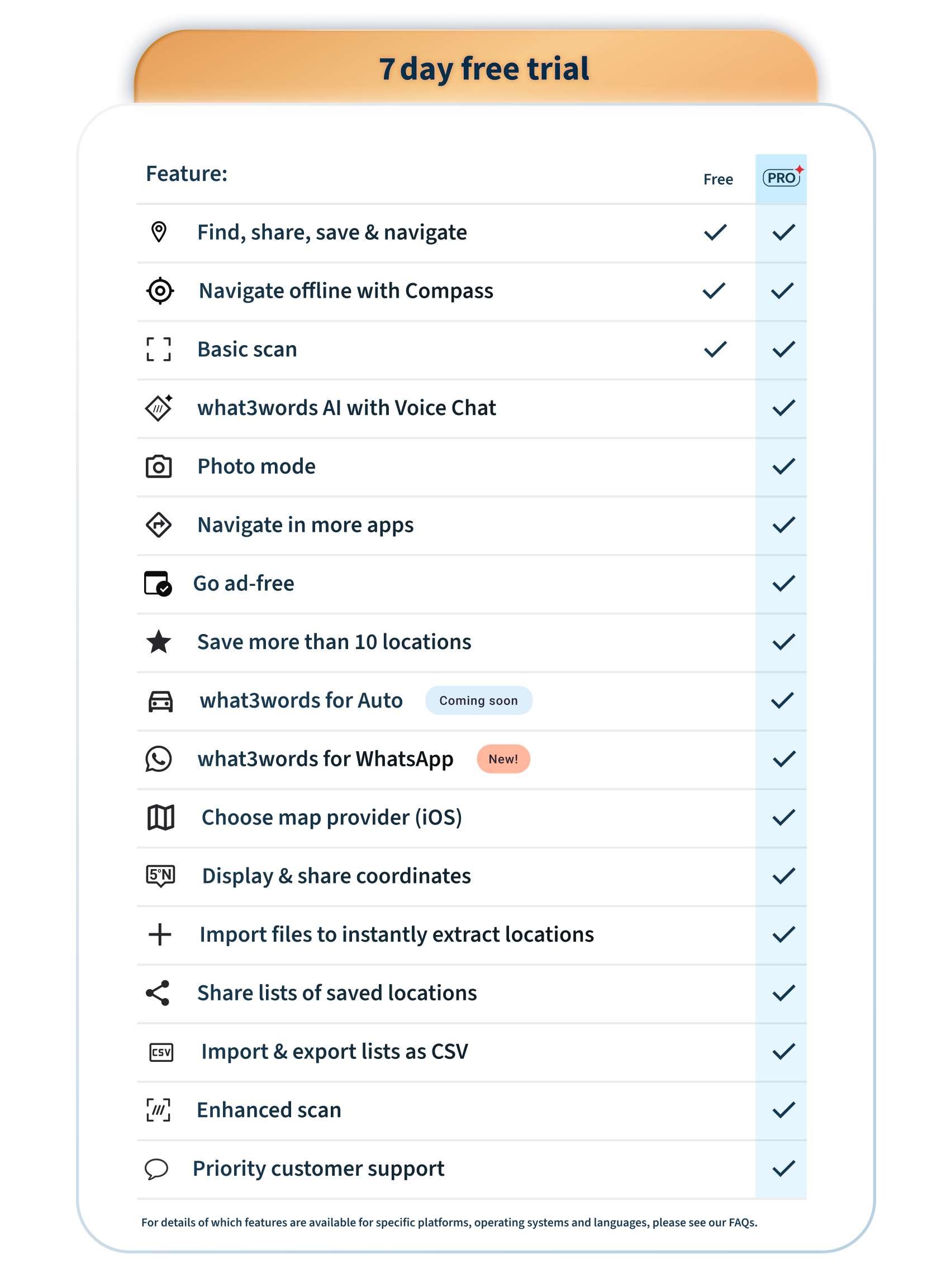 To access Enhanced Scan, you need a what3words Pro subscription. This gives you access to these functions: