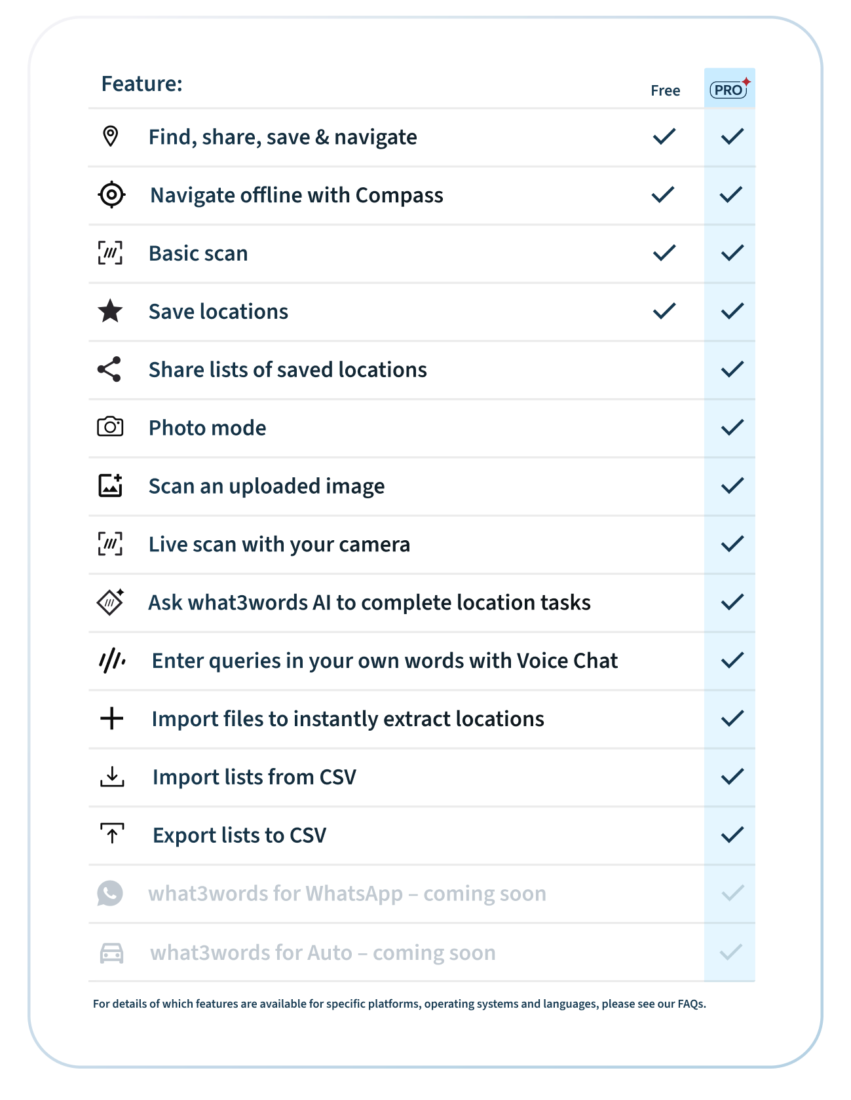 To access Enhanced Scan, you need a what3words Pro subscription. This gives you access to these functions: